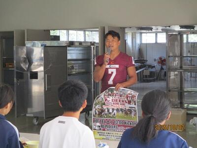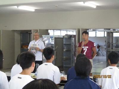 10月2日の給食時に、胎内DEERS小川選手が10月18日(土)に胎内市総合グラウンド陸上競技場で行われる試合のPRをされました。引き締まった体は、日頃のトレーニングによる努力の結晶として輝いていました。