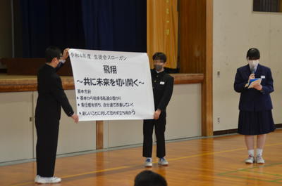 最初に生徒会本部から、令和4年度の生徒会スローガンが発表されました。新しいスローガンは、「飛翔 ~共に未来を切り開く~」です。