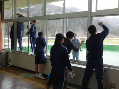 1・2年生の生徒が教室の黒板や窓を磨き、掲示物をはがし、机と椅子を廊下に出して、最後にワックスがけをしました。