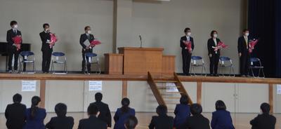 次に1・2年生の代表生徒が、今年度の振り返りと新年度の抱負について発表しました。1年生の生徒は、「家庭学習の質を向上させ、部活動との両立を図りたい」と、意気込みを述べていました。