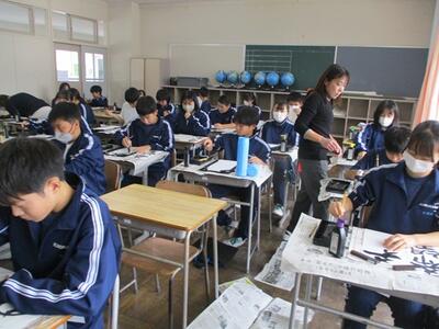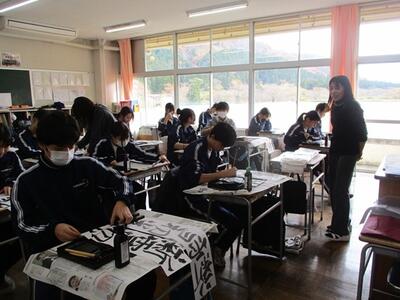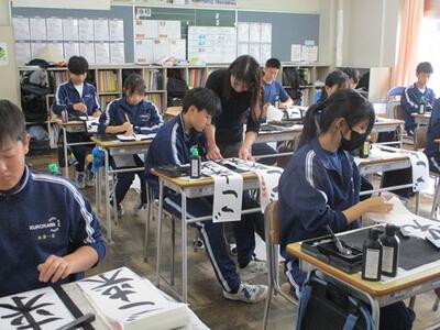 11月25日(火)地域コーディネーターのご協力により、書写の授業において、書道サポーターズより授業を支援していただきました。今回、取り組んだ作品は、保護者面談期間中に展示いたします。その他に、美術科や家庭科の作品も展示いたしますので、ぜひご鑑賞ください。