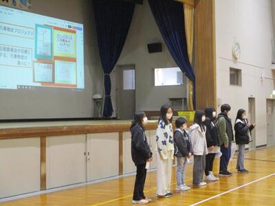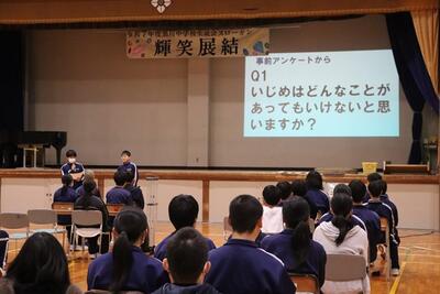 11月25日(火)黒川中学校区いじめ見逃しゼロスクール集会を開催しました。黒川小学校6年生企画委員が、「小学校の取組」についてスライドを使いながら、わかりやすく発表してくれました。黒川中学校生徒会から問題提起として、事前に行ったいじめに対するアンケート結果を紹介し、問題意識を共有しました。その後「ネットいじめを防ぐには、何に注意をするべきか?」を小6~中3までの縦割りでグループ討議をしました。各グループともしっかり話し合い、全体発表の態度も立派でした。6年生も自分の意見を堂々と述べる姿が見られました。