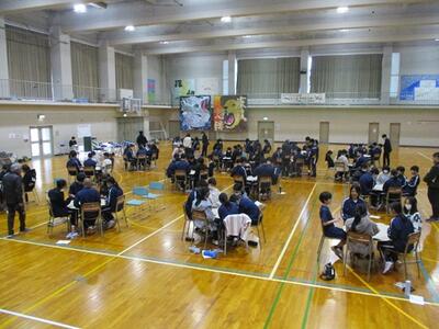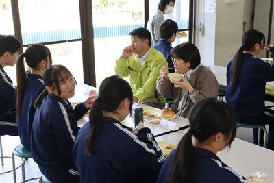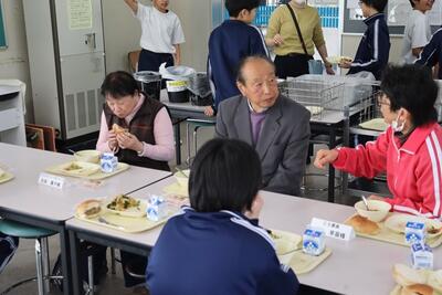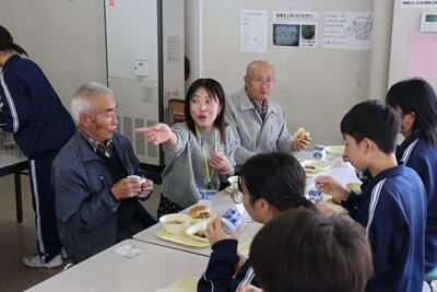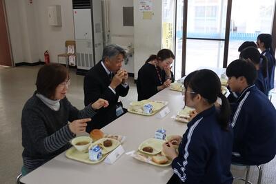 11月27日(木)学校運営協議会、地域コーディネーター、サポーターズの皆様をお招きし、給食を食べる会を実施しました。日頃から中学校の教育活動のために、ご支援・ご協力いただいている方と交流及び感謝を伝える機会として行っています。どのグループも和気あいあいの雰囲気で給食の時間を過ごしました。お忙しい中、来校いただきありがとうございました。これからもよろしくお願いします。