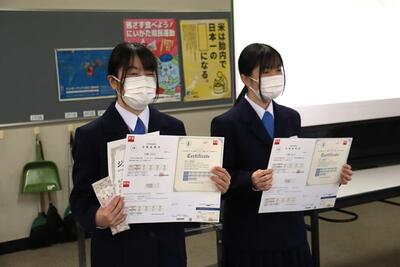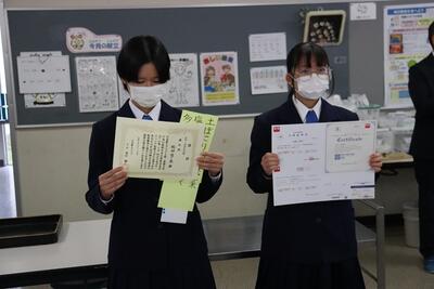 12月がスタートし、今年も残り1ヶ月となりました。全校朝会では、胎内市ジュニア美術展、英語検定、全日本学生・ジュニア短歌大会の賞状伝達が行われました。賞状や合格証を受け取った生徒には、全校生徒から盛大な拍手が送られました。表彰された皆さん、おめでとうございました。
