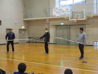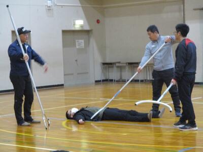 今回の避難訓練は不審者の侵入を想定して実施いたしました。不審者役及び指導講評を新発田警察署胎内分庁舎生活安全課様よりご協力をいただきました。教職員は、不審者の対応と生徒の安全誘導班に分かれ、役割の確認をいたしました。生徒も無事に体育館へ避難し、その後、指導講評とサスマタの使い方や護身術を教えていただきました。胎内分庁舎生活安全課様、ありがとうございました。