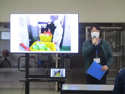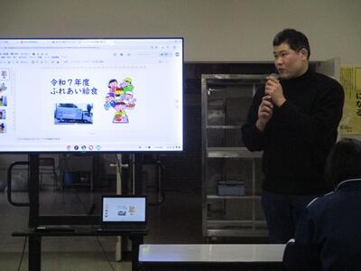 11月18日(火)ふれあい給食で山崎屋の渡辺様、訪問給食として栄養教諭の佐藤先生より給食時に訪問していただきました。渡辺様からは、地元で採れた野菜を給食で食べてもらいたいので、市場で地元産を中心に仕入れるお話しを聞きました。また、佐藤先生からは仕入れた野菜が給食センターに納入される様子や地元野菜の良いところを説明していただきました。毎日、美味しい給食がたべられるのも、たくさんの方々のご協力のおかげと、改めて感じました。
