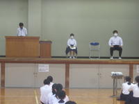 最初に、1~3年生の代表生徒が「2学期の目標」というテーマで発表をしました。家庭学習や部活動に関することに加えて、体育祭や音楽発表会などの行事にも力を入れたいという内容でした。