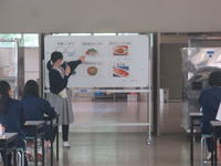 6月15日(火)の給食の時間に、給食センターから学校栄養士の方が来校され、食堂で生徒に食育指導を行いました。週末に下越大会2日目を控える生徒も多い中、健康な身体を維持するために必要な食事のとり方について、イラストを用いた2択のクイズ形式で紹介していました。生徒は栄養士さんの話にしっかりと耳を傾け、質問に対して挙手をして答えるなど、話の内容に興味をもっている様子でした。