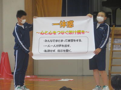 最初に、各学年の代表がスローガンを発表しました。学年の特色や課題曲のイメージを表現したスローガンとなっていました。