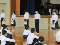 1~3年生の代表生徒がそれぞれ、他学年の先輩・後輩への感謝の気持ちを述べ、学年ごとに作成したメッセージカードを交換しました。1年生代表の生徒は、「初めての体育祭でしたが、3年生の皆さんが優しく教えてくれたおかげで楽しく終えることができました」と、感謝の言葉を述べていました。
