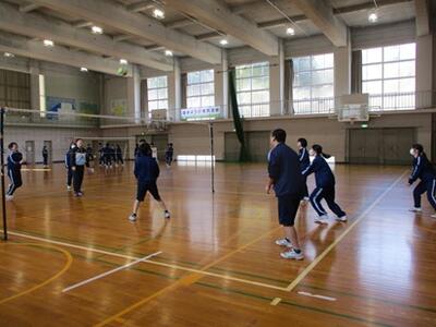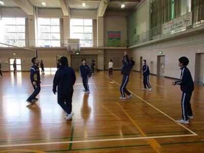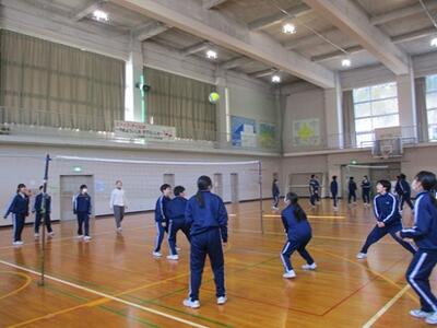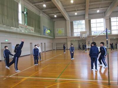 体育館から元気な声が聞こえてきたので行ってみると、1年生が体育の時間にバレーボールをしていました。コートの大きさやボールは正式の規格ではありませんが、オーバーハンドパスやアンダーハンドパスを上手に使っていました。時々スパイクを打つシーンも見られ、1年生の上達した様子が伺えました。