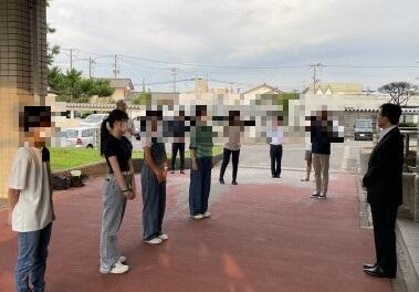 8月6日(火)に行われる広島平和記念式典に学校代表生徒1名が参加します。その出発式が早朝、市役所玄関前で行われましたので、紹介します。