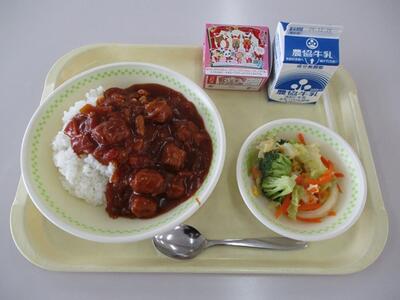 12月18日(木)の給食は、クリスマス献立でした。もみの木に見たてたブロッコリーとカラフルな野菜、星形のチーズの入ったサラダ。コロコロしたミードボールの入ったハヤシライス。そして、クリスマスケーキ。いよいよクリスマス!と言う気分にさせてくれる給食でした。