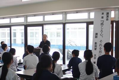 7月17日(木)黒川中学校卒業生の彫刻家:大平實様をお迎えして、講演会及びワークショップを行いました。大平様から自身の中学生・高校生の頃のエピソードや彫刻家を目指したきっかけ等をお話しいただきました。また、「真実とは、自分が確認したこと」や「自分ですべてを判断できる力が必要である」など、生徒にとってこれから役に立つお言葉をいただきました。その後のワークショップでは、2つの作品を制作しました。初めに黒川の木や水晶など自然の素材を使ったマグネットバーを作りました。思い思いに材料を張り合わせたり、色を塗ったりして完成させました。次に、自分にとって大事な日を記した木片に色を塗り、ケースに入れて中庭にある、大平先生の作品「思考の箱」の池に浮かべました。どちらも思い出の作品として大切に使ったり、飾ったりしてください。