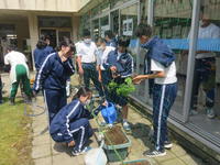 6月11日(金)の昼休みに、ボランティア委員会の生徒が地域コーディネーターの方の指導のもと、プランターにゴーヤの苗を植える作業をしました。前日に数名の地域ボランティアの方によってネットが張られており、今回植えられたゴーヤは成長するとそのネットを伝って上に伸びていき、8月ころには「グリーンカーテン」が完成する見通しです。ボランティア委員の生徒は、当番で定期的にゴーヤの水やりをすることになっています。
