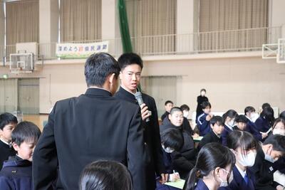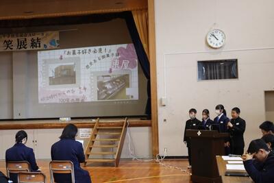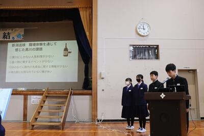 12月12日(金)キャリア学習発表会が行われ、1・2年生が今まで総合的な学習の時間で活動したことや学んだことをグループごとに発表しました。1年生は、黒川PR作戦の活動をとおして、黒川の魅力を伝えました。2年生は、新潟巡検や職場体験で学んだことを地域活性化にどのように生かすかの展望を発表しました。スライドを使って見やすく丁寧にまとめていましたし、途中で聞き手に質問をしたりするなどの工夫が見られました。体育館の壁には、2年生が行った職場体験のまとめを掲示しました。