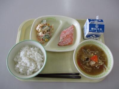 今日の給食は、「佐渡の日」にちなんで、胎内市で孵化し、「どっこん水」の水槽で約1年間過ごし、その後、佐渡の海で養殖された鮭が提供されました。胎内市で産まれた鮭と知ると、更においしく感じました。